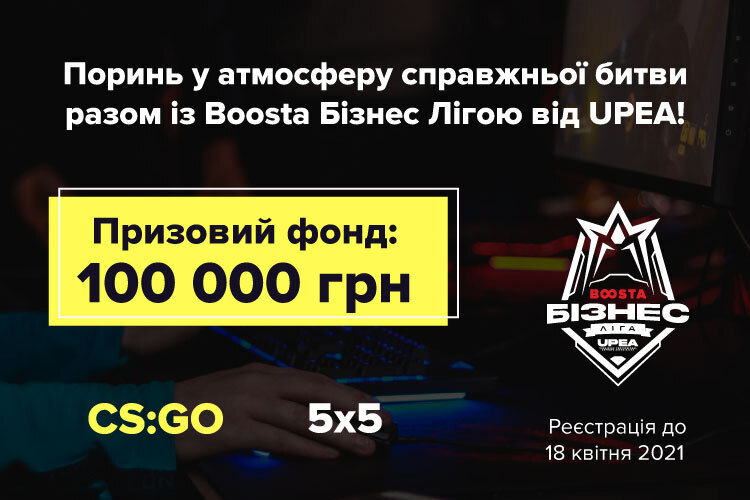 Boosta Бізнес Ліга - це всеукраїнський кіберспортивний турнір з CS:GO між компаніями з призовим фондом 100 000 грн. Кожен співробітник із будь-якої галузі бізнесу в Україні може зібрати команду та приєднатися до битви. Участь у турнірі абсолютно безплатна.