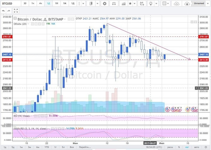 До кінця червня ренджева волатильність знизилася, тижневі цінові максимуми встановлювалися нижче за попередні, а тижневі мінімуми не оновлювалися. Сильна і стабільна підтримка в районі $2400.