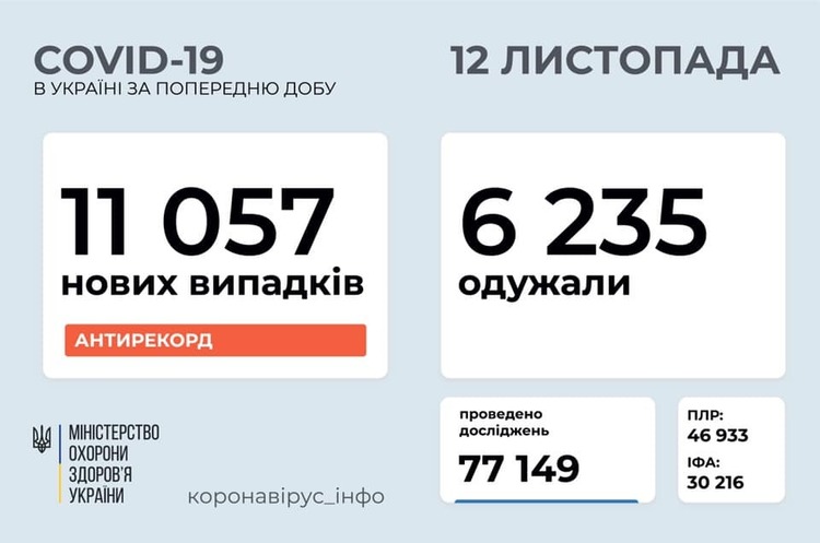 «11 057 нових випадків коронавірусної хвороби COVID-19 зафіксовано в Україні станом на 12 листопада 2020 року. Зокрема, захворіли 428 дітей і 564 медпрацівники. Також за останню добу госпіталізовано – 1 509 осіб, летальних випадків – 198, одужали – 6 235 осіб», – написав Степанов