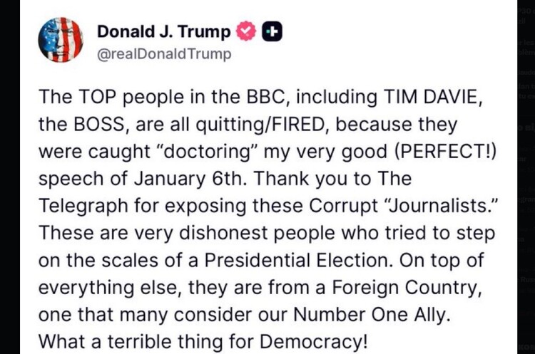 Трамп у своїй мережі TruthSocial прокоментував відставку гендиректора ВВС, написавши: