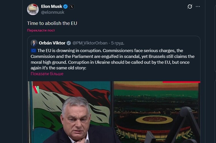 Примітно, що пост Маска про ліквідацію ЄМ прокоментував кремлівський «спікер» Дмітрій Мєдвєдєв, написавши: «Точно».
