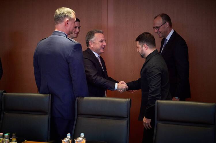 США представляють спецпосланник президента Дональда Трампа Стів Уіткофф та зять Трампа Джаред Кушнер. Також на зустрічі є канцлер ФРН Фрідріх Мерц.
