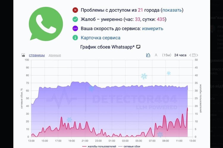 У росії зафіксовано масштабні перебої в роботі месенджера WhatsApp, який залишається одним із найпопулярніших засобів комунікації в країні. За даними російських і міжнародних моніторингових сервісів, швидкість роботи додатку впала на 70–80%, а кількість скарг від користувачів різко зросла по всій території рф.