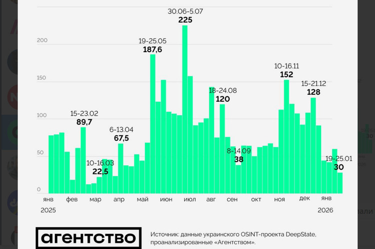 Особливо помітним стало уповільнення в останній тиждень – з 19 до 25 січня російська армія просунулася лише на 30,4 кв. км, що є мінімумом із весни 2025 року. Для порівняння: у березні минулого року найнижчий тижневий показник становив 22,5 кв. км.