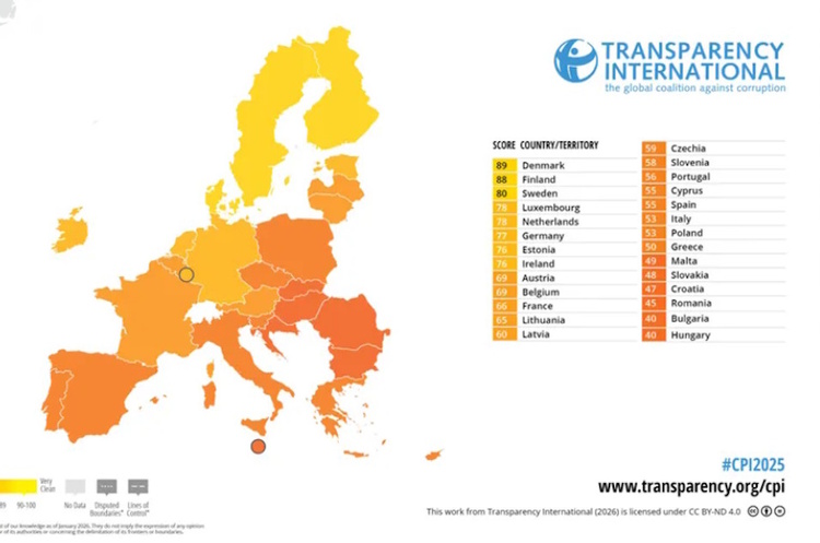 Transparency International оприлюднила новий Індекс сприйняття корупції (CPI-2025), який оцінює 180 країн за рівнем корупції в державному секторі за шкалою від 0 до 100 балів, де більший показник означає нижчий рівень корупції.