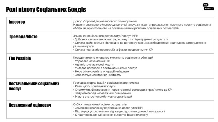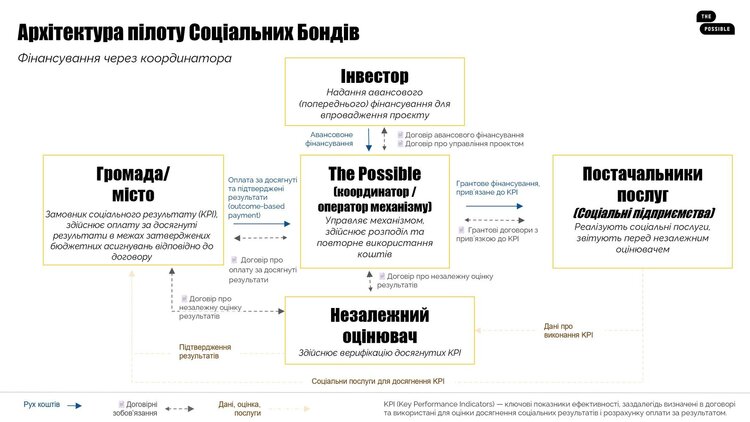 На жаль, українське законодавство поки не готове до впровадження соціальних бондів на широкому рівні. Поки будь-яке повернення коштів з боку органів місцевого самоврядування за результатами реалізації проєкту можливе лише тоді, коли є формальні відносини між громадською організацією та органом місцевого самоврядування.