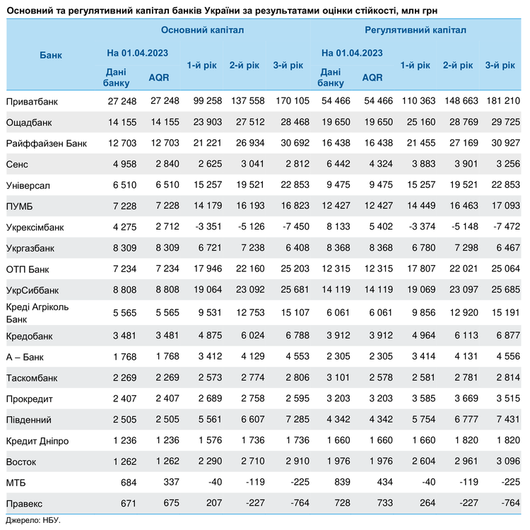 Для решти трьох банків – Правекс Банку, Укрексімбанку та МТБ Банку – потреба в капіталі на грудень 2023 року становила приблизно 10 млрд грн. Ця сума потрібна для досягнення цільової достатності капіталу, яка гарантуватиме дотримання банками нормативних значень у прогнозному (трирічному) періоді.