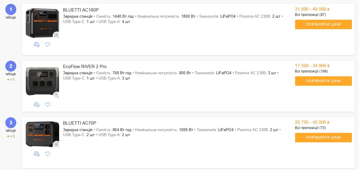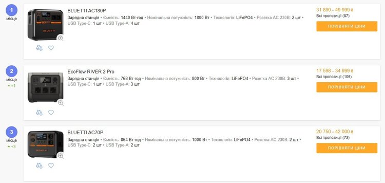Отже, ціни на такі АКБ зараз в діапазоні від 15 960 грн до 276 575 грн. Розбіжність вартості на топ-3 популярні моделі – величезна: в 2-6 разів (див. нижче скрін).