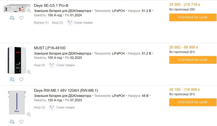 Для аналізу цін Mind відібрав літій-залізо-фосфатні акумулятори (LiFePO4), як найбільш безпечні та оптимальні для використання у домогосподарствах. Другий фільтр – ємність від 100 ампер на годину, третій – напруга від 24 В. Цього обсягу (який акумулює потужність від 5 к Вт) має вистачити на комфортне живлення квартири при віялових відключеннях. Більш зрозумілого користувацького фільтру (потужності в Вт) на Нotline, на жаль, немає.