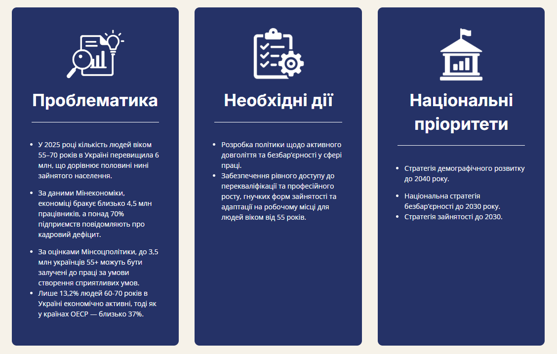 За даними Мінсоцполітики, вже до 2030 року кожен четвертий українець буде старше 60 років. Водночас лише 13,2% людей віком 60–70 років працевлаштовані, тоді як у країнах ОЕСР середній показник становить 37%. Наразі Україні бракує близько 4,5 млн працівників, а до 2 млн людей пенсійного віку могли б бути залучені до роботи за умови створення сприятливих умов, гнучких форматів зайнятості та подолання стереотипів. Дослідження має визначити, що саме допоможе людям старшого віку залишатися активними або повертатися на роботу. Його результати стануть основою для розробки практичних рішень, які сприятимуть залученню покоління 55+ до ринку праці та зменшенню кадрового дефіциту в Україні.