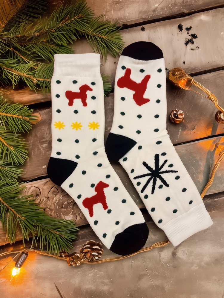 Шкарпетки «Хеппі нью кінь» – яскравий новорічний акцент, який легко працює і самостійно, і як частина подарункового боксу. Різдвяний принт із зображенням головного символу нового року сподобається людині, яка любить яскраві та затишні речі.