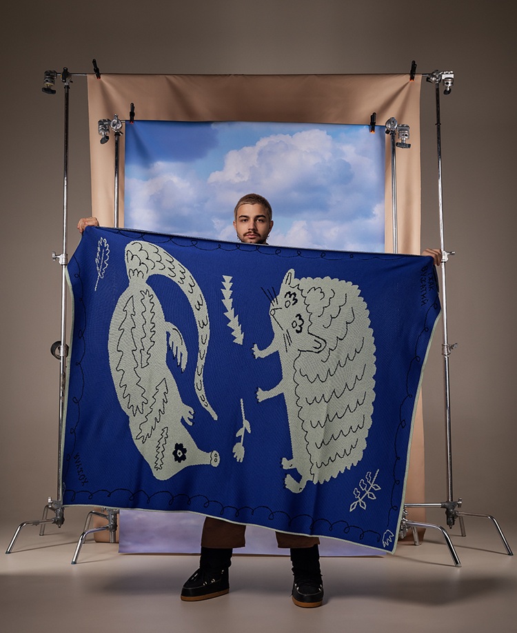 Плед Хохуля та їжак – частина колекції про червонокнижних тварин, які зникають через війну або людську недбалість. Хохуля – найдавніша представниця сучасної фауни Європи, має статус реліктового виду під загрозою зникнення та охороняється довгим переліком природоохоронних документів. Їжак вухатий – ще один зникомий вид, якого зрідка можна було зустріти в Луганській та Донецькій областях. Нині через війну невідомо, чи колись ми побачимо цю рідкісну тварину.