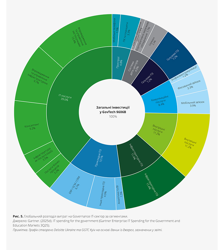У 2025 році світові державні витрати на ІТ перевищили $606 млрд. Найбільша частка – 39% – припадає на послуги: консалтинг, впровадження застосунків і керовані послуги, інфраструктура як послуга тощо.