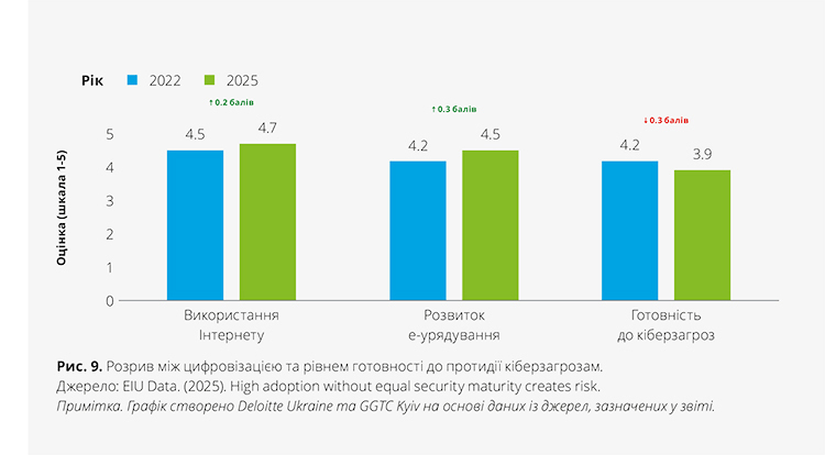 Так, у країнах ЄС спостерігається зростання темпів використання інтернету та цифровізації державних послуг, водночас вони демонструють зниження готовності до кібербезпеки у 2025 році порівняно з 2022-м.
