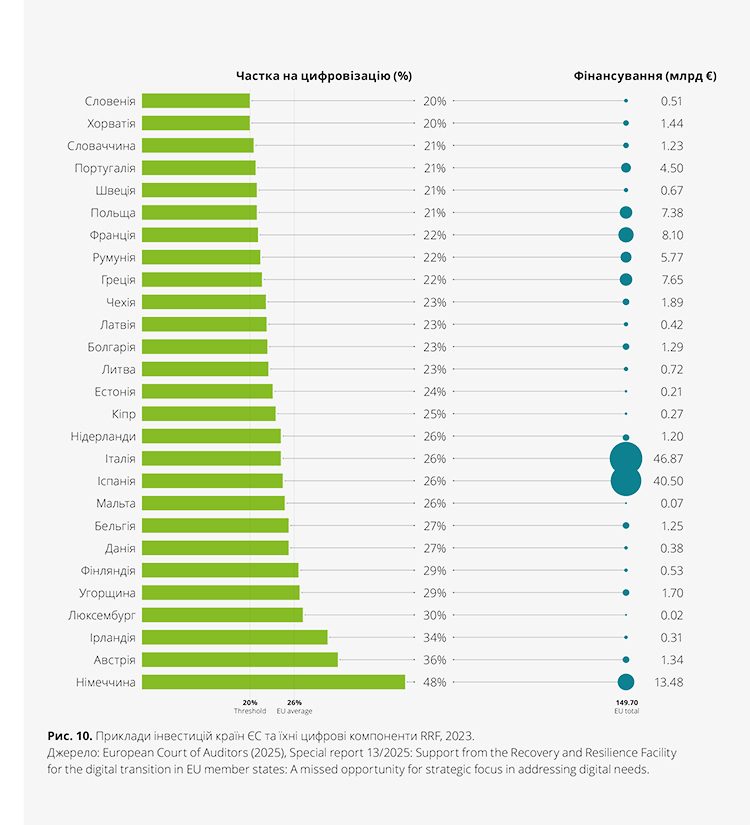 Цікаво, що фактична середня частка цифрових інвестицій у національних планах перевищує цей мінімальний поріг і становить 26%.