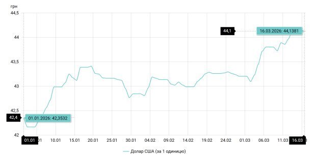 За неповні три місяці 2026 року рівень девальвації національної валюти до долара перевищив 4%, і до середини березня курс перетнув позначку 44 грн/$. Водночас вартість гривні до євро майже не змінилась, курс залишився в діапазоні 50–51 грн/євро.