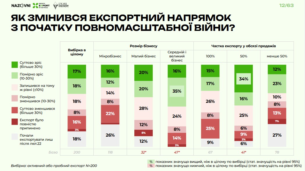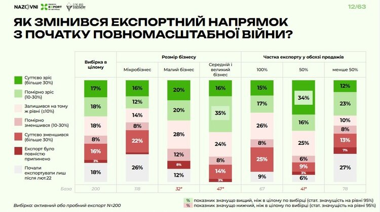 Після початку вторгнення рф 16% респондентів значно зменшили обсяги експорту (на понад 30%), ще 3% повністю його припинили. Одночасно 17% компаній суттєво наростили продажі за кордон і 18% респондентів мали помірне зростання (10–30%).