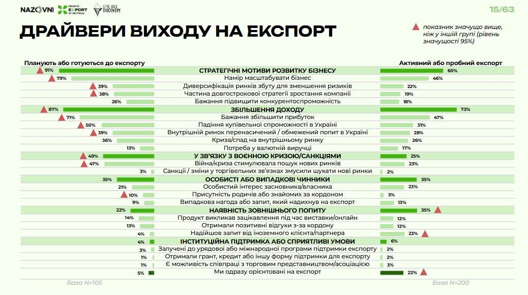 Примітно, що домінуючі мотиви компаній, які наразі лише планують вийти за кордон, і підприємств, що вже це зробили, відрізняються. Перша група більшою мірою мотивована наявними перешкодами на українському ринку: війна та криза (49% респондентів), падіння купівельної спроможності (50%) і перенасиченість внутрішнього ринку (39%). Ця група, на думку дослідників, має завищені очікування щодо стратегічного розвитку (91% – проти 60% у активних експортерів) і збільшення доходу (87% проти 73%).