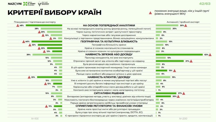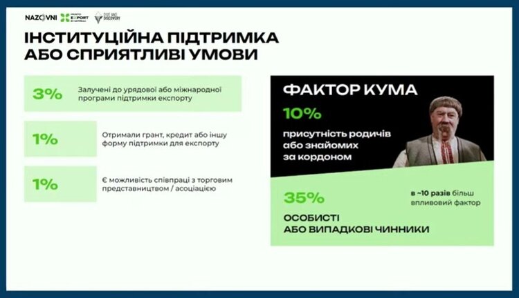 «Для 10% потенційних експортерів важливим мотивом виходу за кордон є проживання там кума, брата, свата. Для порівняння: фактори інституційній підтримки – залучення до урядової або міжнародної програми, отримання гранту, можливість співпраці з торговим представництвом – мають мешу вагу. Тобто «фактор кума» більш впливовий, ніж інституційна підтримка. Втім, основний інсайт – інституційна підтримка має самий низький показник серед мотивів виходу на експорт», – пояснює Олександр Власенко.