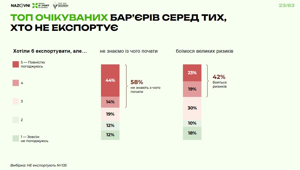 «На питання, чому компанія поки не експортує, більшість опитаних відповіли: не знають, як саме це робити. Наприклад, як відправити 20 кг сала до Ізраїлю (це не вигаданий кейс). Також маємо значний відсоток тих, кого зупиняє очікування ризиків. Тобто спочатку ми вигадуємо «драконів», а потім боїмося виходити на експорт, тому що ті вигадані труднощі нам заважають», – вважає CEO Prosto Export by Netpeak.