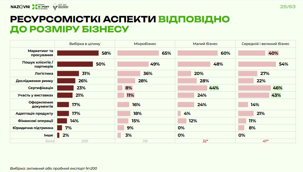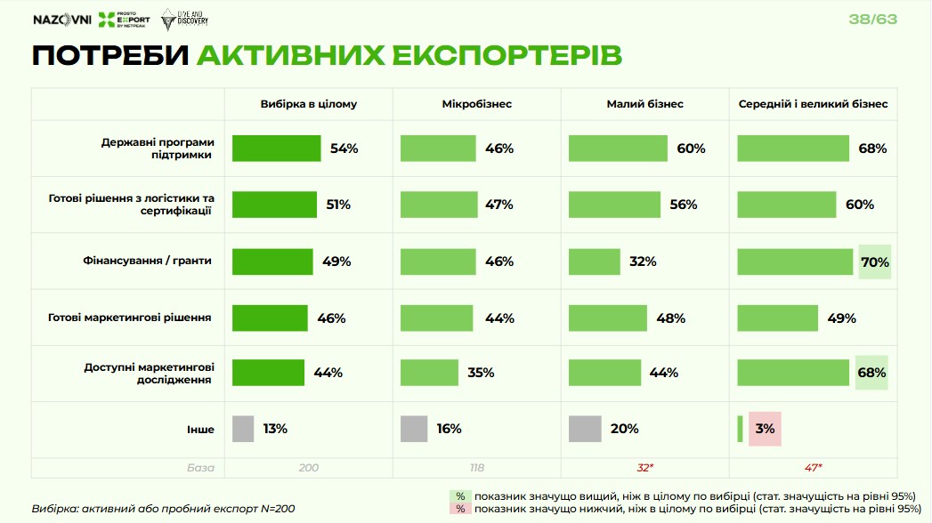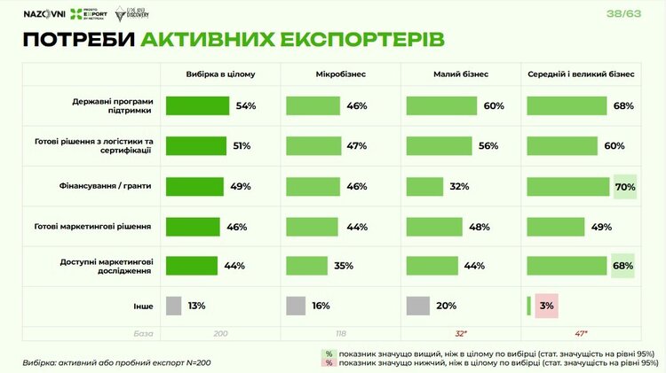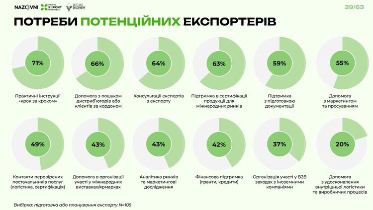 «Тоді як 71% потенційних експортерів потребують практичної покрокової інструкції. На другому місці – допомога з пошуком дистриб’юторів, хоча ця потреба здебільшого великого бізнесу. Далі йде запит на різноманітну підтримку – із сертифікацією, підготовкою документів, маркетингом тощо», – пояснює Олександр Власенко.