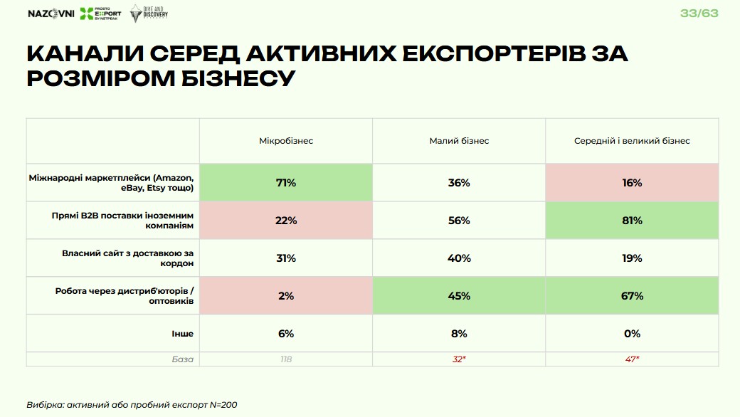 Серед мікробізнесу домінують продажі через маркетплейси, а в малих, середніх і великих гравців головний канал – прямі В2В-постачання іноземним компаніям.