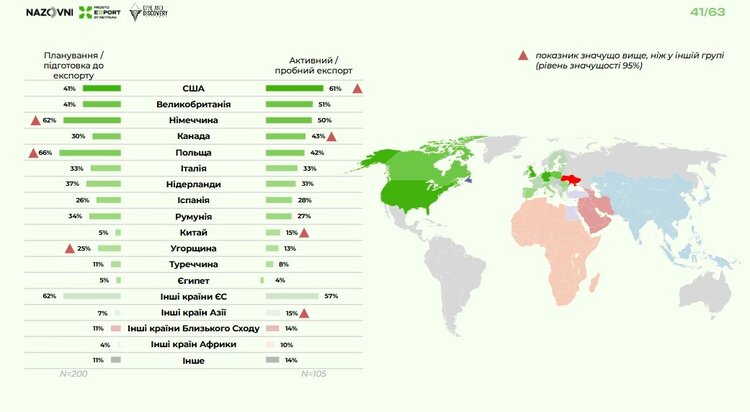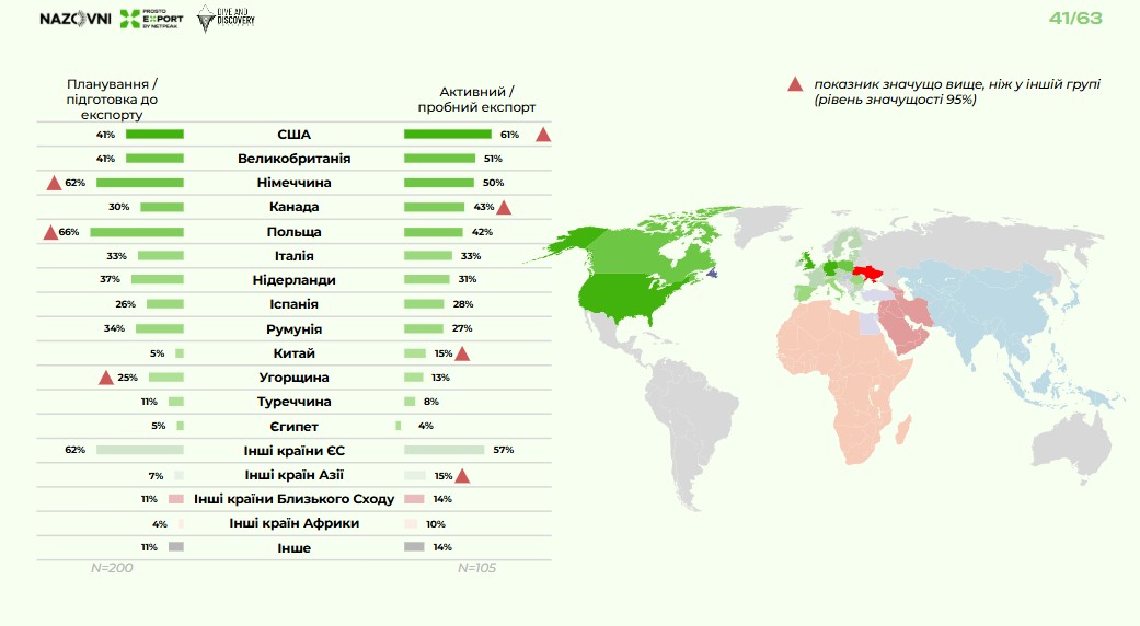 Активні експортери найбільше постачають до США, Великої Британії, Німеччини, Канади та Польщі.