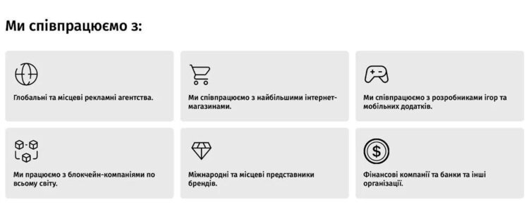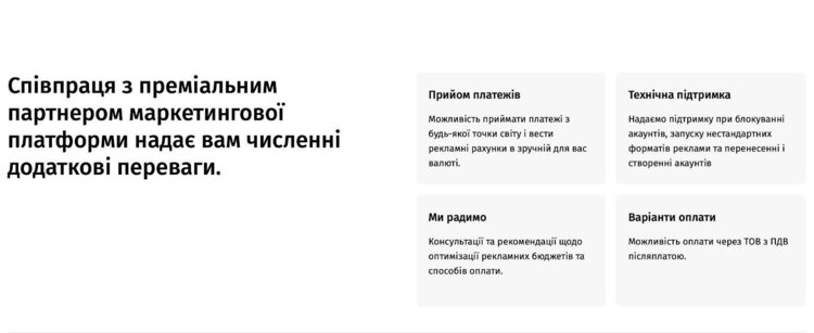 Головна перевага і унікальність – це можливість поповнювати будь який рекламний сервіс через одного партнера. Компанія допомагає перетворити міжнародну digital-рекламу з безлічі окремих дій на єдину цілісну бізнес-систему. Для підприємця це означає менше ручного керування, менше ризиків зупинок, менше конфліктів між відділами та більше прогнозованості на рівні бізнес-процесів.