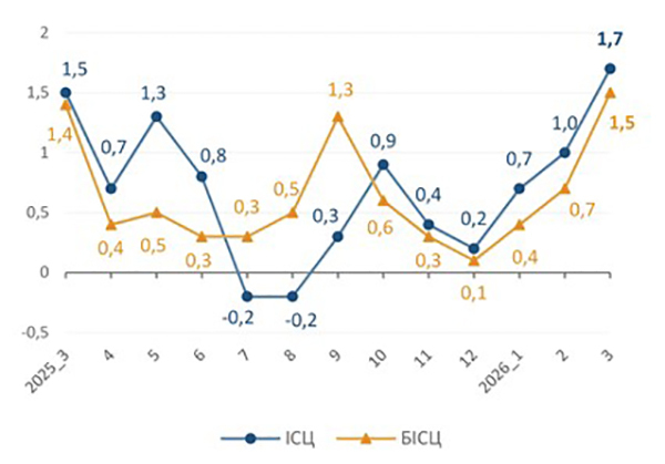 У лютому – березні значно зріс вплив проінфляційних факторів, починаючи з глобального зростання цін на енергоносії через воєнний конфлікт на Близькому Сході, закінчуючи скороченням виробництва окремих видів продукції в Україні, здорожчанням імпорту та нестачею зовнішнього фінансування.
