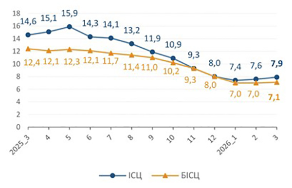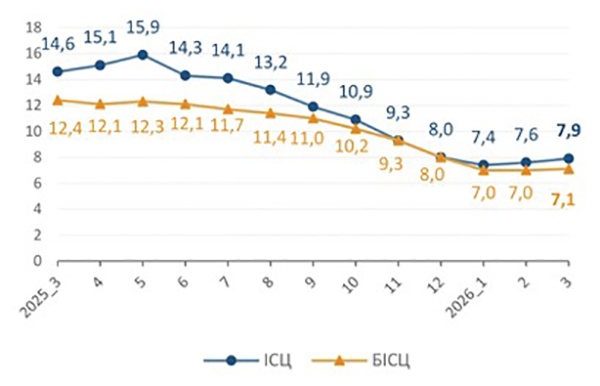 Річний рівень інфляції досяг мінімуму в січні 2026 року – він становив 7,4% проти 8% у грудні 2025-го. Але вже в лютому зростання цін рік до року сягнуло 7,6%, а в березні – 7,9%. Базова інфляція (не враховує сезонність та адміністративно регульовані ціни) залишилася майже незмінною – у січні – лютому вона становила 7%, а в березні – 7,1%.