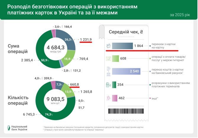 Згідно з даними НБУ, у 2025 році було здійснено 661 млн р2р-переказів за картками українських банків на 1,23 трлн грн проти 673 млн переказів на 1,31 трлн грн у 2024-му.