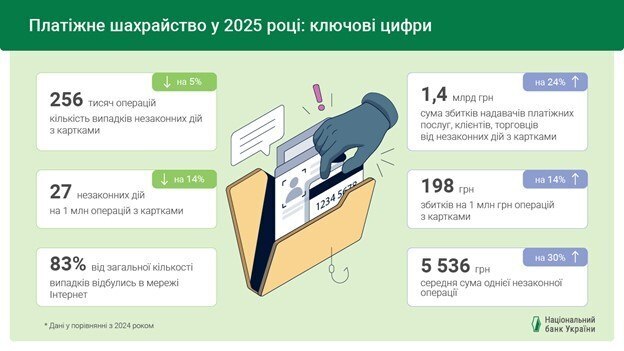Як підрахував НБУ, протягом 2025 року в Україні було зафіксовано 256 тис. шахрайських операцій з використанням платіжних карток, що на 13,3 тис. (на 5%) менше, ніж у 2024 році. Відповідно на кожен мільйон карткових трансакцій у 2025 році припадало 27 fraud-операцій.