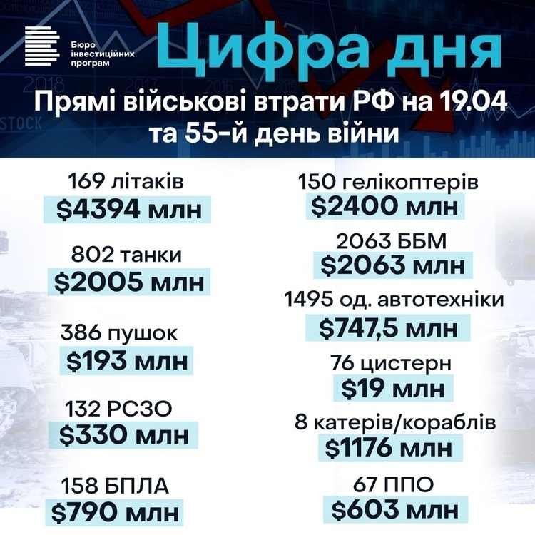 Детали. Методология расчета прямых военных потерь России от экспертов Бюро инвестиционных программ: официальные данные от Вооруженных Сил Украины и ГСНУ о количестве уничтоженной техники врага умножают на рыночные цены этой военной техники. Цены берутся из открытых источников, анализа данных о тендерных закупках военной техники, прайс-листов из открытых источников за последние три года. Подсчет производится с 15 марта 2022 года.